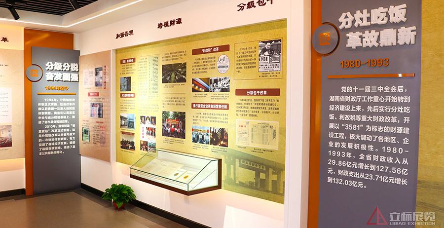 湖南省財政廳歷史陳列館是一個湖南省財政歷史的象征和文化建設(shè)的重要標志,是展示歷史、文化傳承的重要窗口。 展館主要以現(xiàn)代電子觸摸屏與傳統(tǒng)圖文展板相結(jié)合,配以部分有歷史感的實物,回顧省財政廳的風雨歷程,展示財政工作對湖南經(jīng)濟社會發(fā)展所發(fā)揮的宏觀調(diào)控、政策保障和資金支持作用以及財稅文化的深厚底蘊。綜合采用實物、圖片、文字、觸摸屏手段等方式展現(xiàn),按照“內(nèi)容實事求是、文字準確精煉、設(shè)計前瞻新穎、布展美觀大方、通盤留有余地”思路進行。