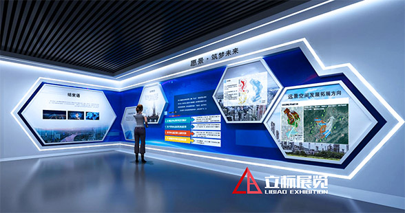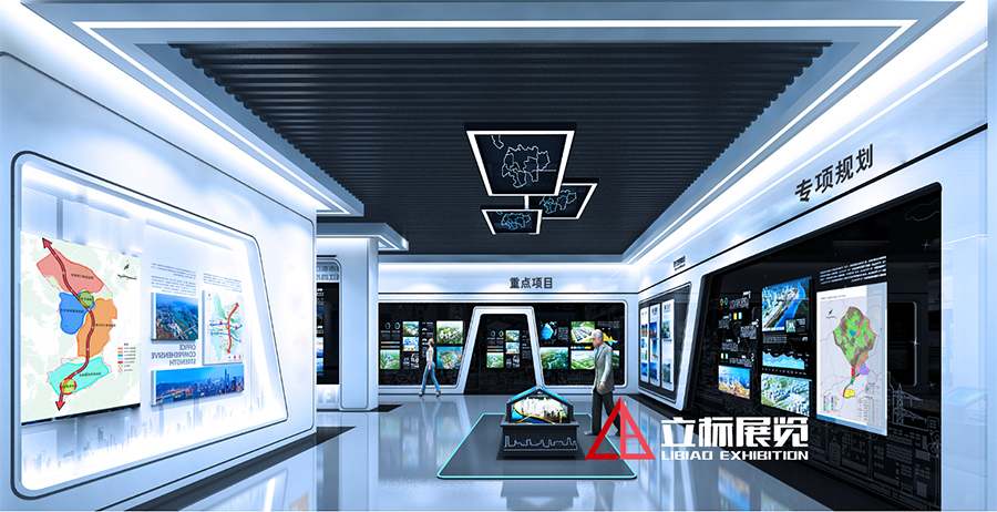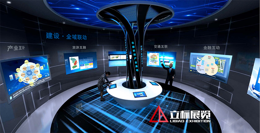 本館在展板、模型、實物陳列等常見形式之外,綜合運用聲、光、電、圖像、三維動畫展示技術(shù)等,重點打造“巨幅LED主題影院”、“球幕多屏聯(lián)動平臺”、“L幕數(shù)字沙盤”、“LED條形光電創(chuàng)意柱”等多媒體展項,使各篇章的主題演繹異彩紛呈,觀展的情緒和體驗富于變化,生動、形象地展示園區(qū)的飛速發(fā)展和規(guī)劃建設(shè)成果。