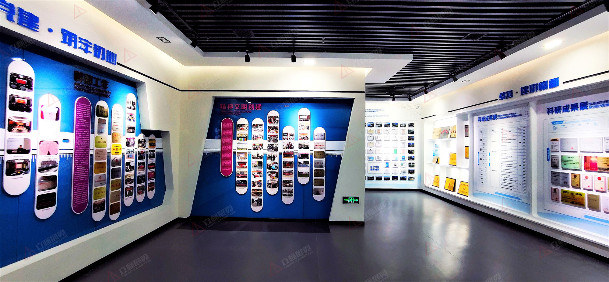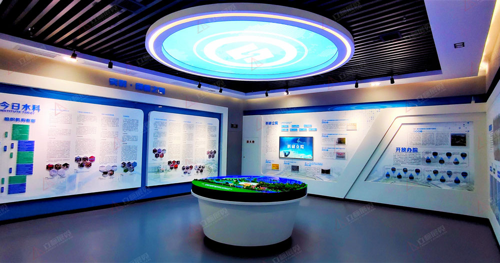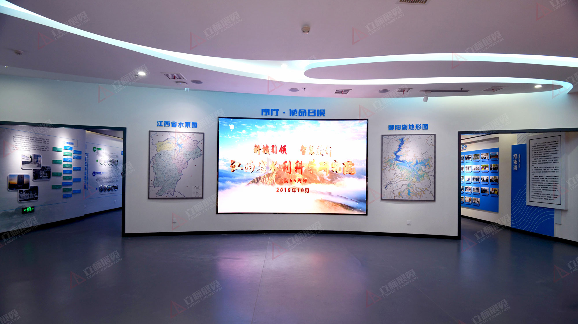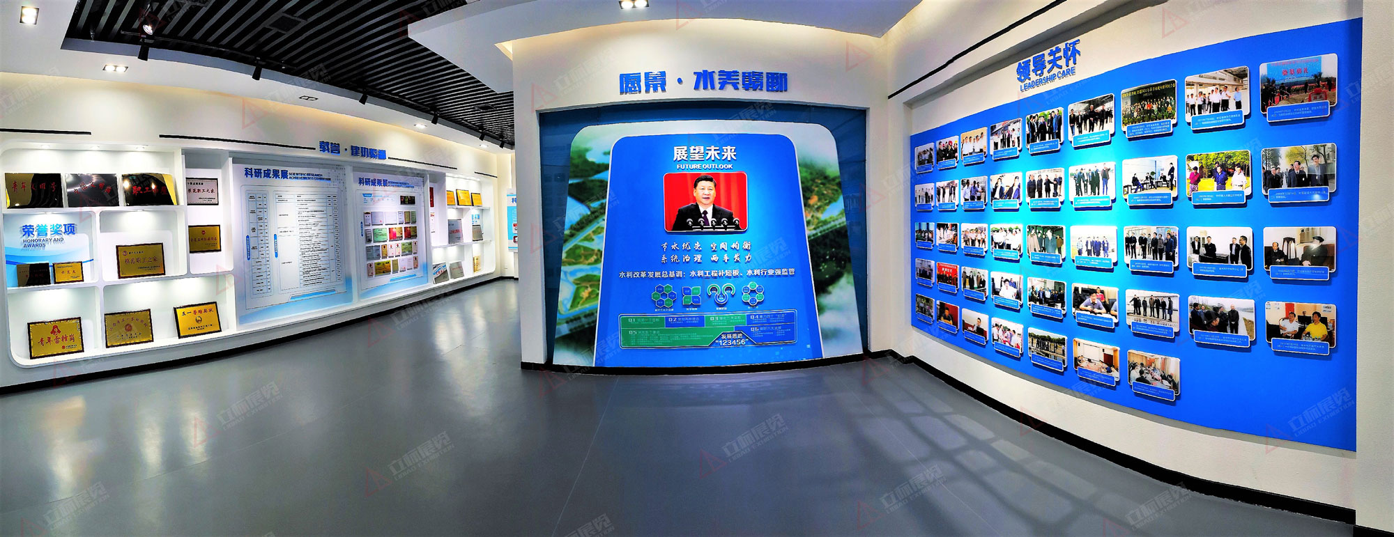 展館突出“水”元素,強化“水”主題,展現(xiàn)“水”文化特色,設計元素契合水科院文化特色綜合運用聲光電,結(jié)合投影、場景裝置以及互動裝置等,展示形式多樣化豐富天花、地面、界面的色調(diào)、造型表現(xiàn),各個版塊空間的調(diào)性有所區(qū)分,使小空間的主題演繹異彩紛呈,使觀展節(jié)奏更加張弛有度。